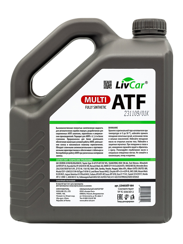 Содержит современные присадки, гарантирующие требуемую защиту от износа и совместимость с материалами уплотнительных соединений. Высокий уровень фрикционных свойств обеспечивает отличные характеристики переключения передач. Благодаря полностью синтетическому базовому маслу трансмиссионная жидкость LIVCAR ATF MULTI подходит для использования в широком диапазоне температур. Допускает использование при более продолжительных интервалах между заменами (с учетом условий и возможных рисков).